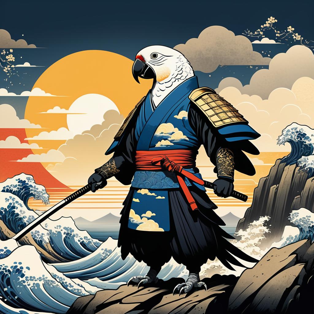 Digital artwork depicting a white and blue parrot dressed in traditional samurai armor with a red sash, standing amidst ocean waves under a stylized sunset with a red and yellow sun. The image features Japanese-inspired elements with dramatic clouds and rocky coastline.
