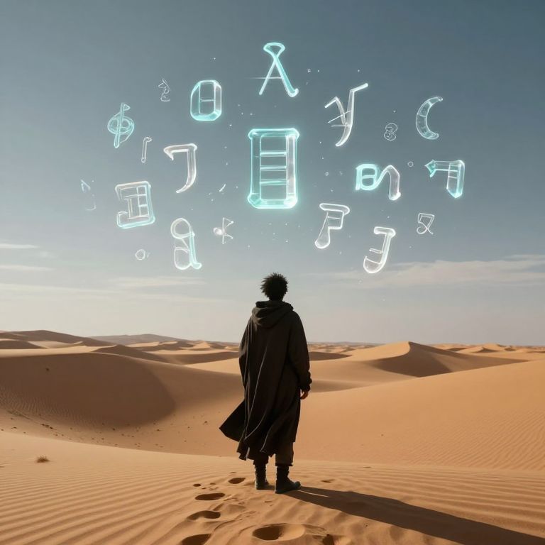 In a surreal, cyberpunk-inspired desert landscape rendered in high-definition detail, a linguist clad in a dark cloak stands amidst rolling sand dunes, gazing at a cluster of luminous, glass-like glyphs that float and orbit above, each symbolizing crystallized phonemes and their meanings in a silent, otherworldly dialogue.