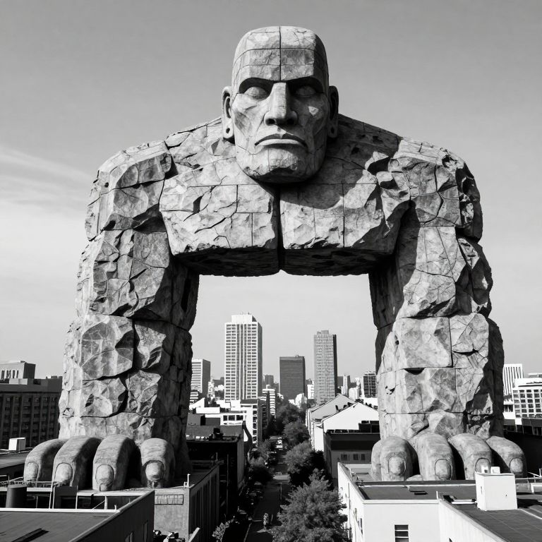 This is a black-and-white photograph of a massive, rock-like sculpture depicting a muscular, crouching figure with a stern expression. The sculpture, positioned in an urban setting, has large, textured, jagged rocks forming its body, and prominent, thick fingers resting on the ground. In the background, a cityscape with several tall buildings and a clear sky is visible through the sculpture's open space between its legs. The contrast between the rough texture of the sculpture and the smooth, modern city buildings creates a striking visual effect. The photograph emphasizes the scale and imposing presence of the sculpture against the city's skyline.
