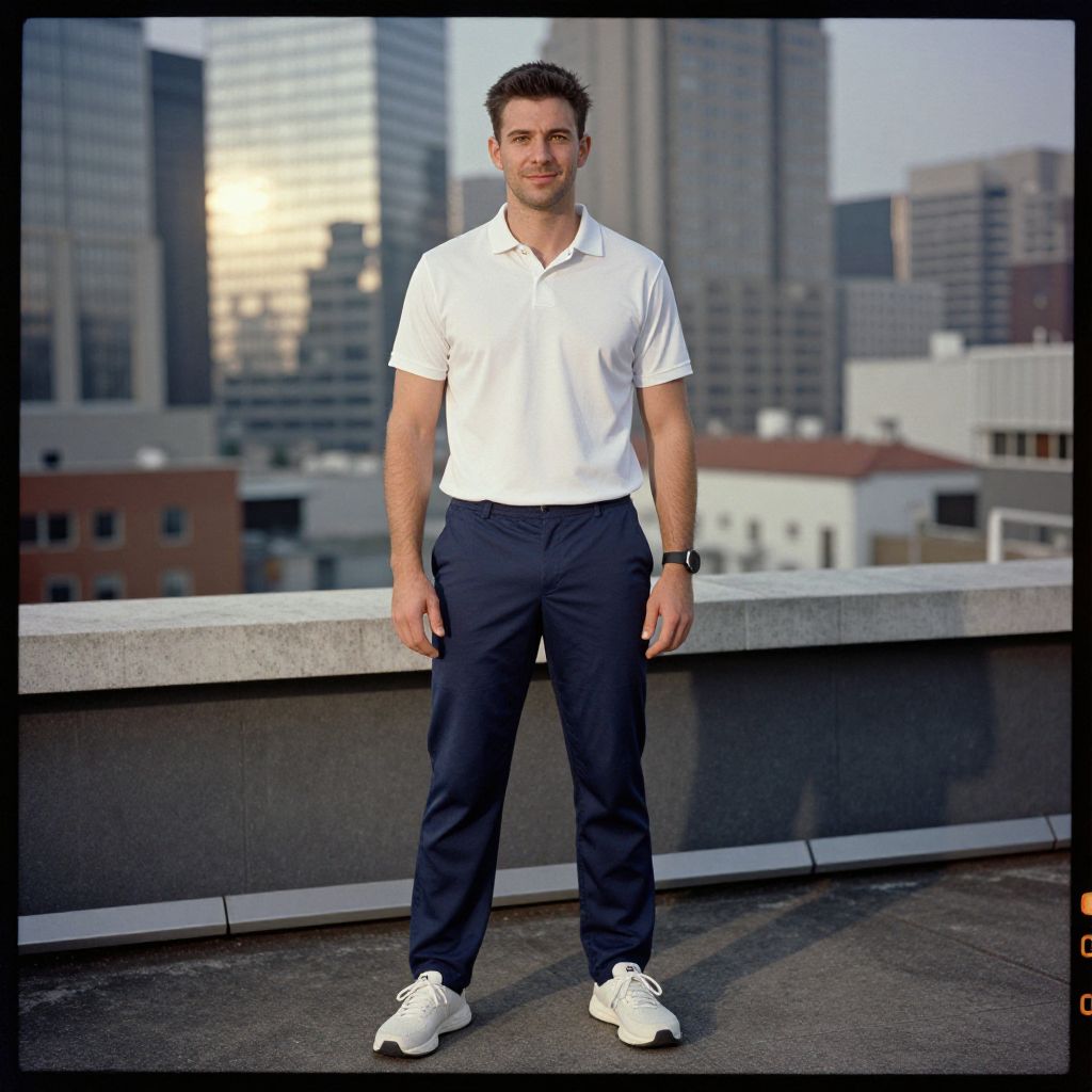 A man, white moisture-wicking polo shirt, navy blue cricket trousers, lightweight breathable sneakers, matching navy blue cricket socks, performance fabric for comfort, rooftop installation, urban skyline backdrop, sunlight reflecting off glass surfaces, calotype process, relaxed smile, confident demeanor. Man has masculine face and piercing eyes