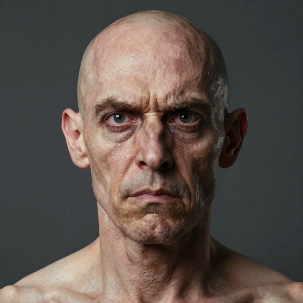 The worlds ugliest man with exaggerated crooked features, asymmetrical face, bald head, grotesque expression, surreal detail, hyper-realistic style, dramatic lighting