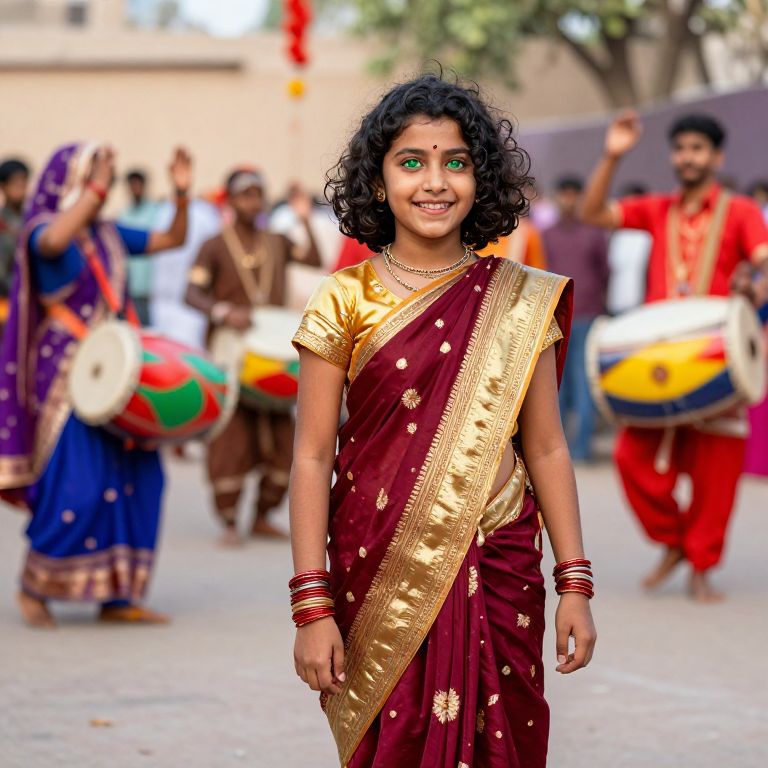 A young girl with curly black hair and bright green eyes wearing a brightly colored lungi made of rich silk in deep maroon and gold, standing joyfully in a festive cultural fair in Rajasthan, where traditional dancers are performing and colorful drums are being played in the background.