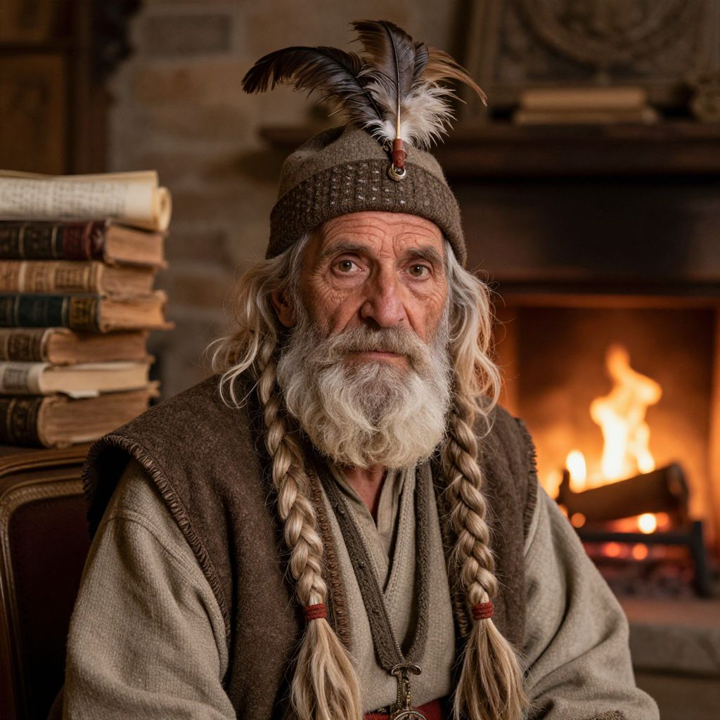 Photograph of an elderly white man with a long, white beard and braided hair, wearing a brown, feather-decorated headband, and a dark brown vest over a beige tunic. He sits in front of a lit fireplace, with a stack of old, leather-bound books to his left. The man's weathered face shows deep wrinkles, and his expression is thoughtful. The background features a brick wall and the warm glow of the fire, creating a cozy, rustic atmosphere. The image has a rich, detailed texture, highlighting the man's medieval-style attire and the ambient light.