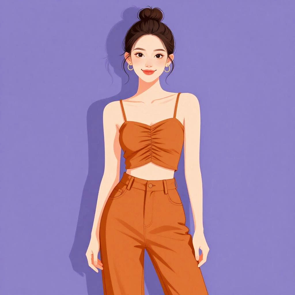 Woman with pretty face and pretty hair. smiling Woman, contemporary casual, ruched mustard crop top, square neckline, thin straps, matching high-waisted wide-leg pants in burnt orange, side slit detail, minimalist gold stud earrings, natural makeup, loose bun hairstyle, neutral studio background. --sref 1467