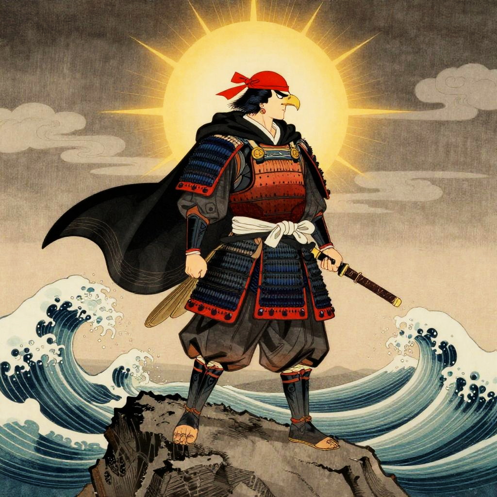 Tua heroic otter dressed as a samurai warrior, wearing lamellar samurai armor and hakama with subtle wave motif, a midnight black cape with silver edging and scarlet red headband, standing defiantly with one paw on the sword hilt on a wind-swept rocky promontory amidst churning teal ocean waves crashing below, backlit by a radiant golden sun low on the horizon, strong rim light and surrounded by stylized curling sumi clouds, executed in traditional Japanese ukiyo-e style with dramatic composition, bold lines, and vintage color palette
