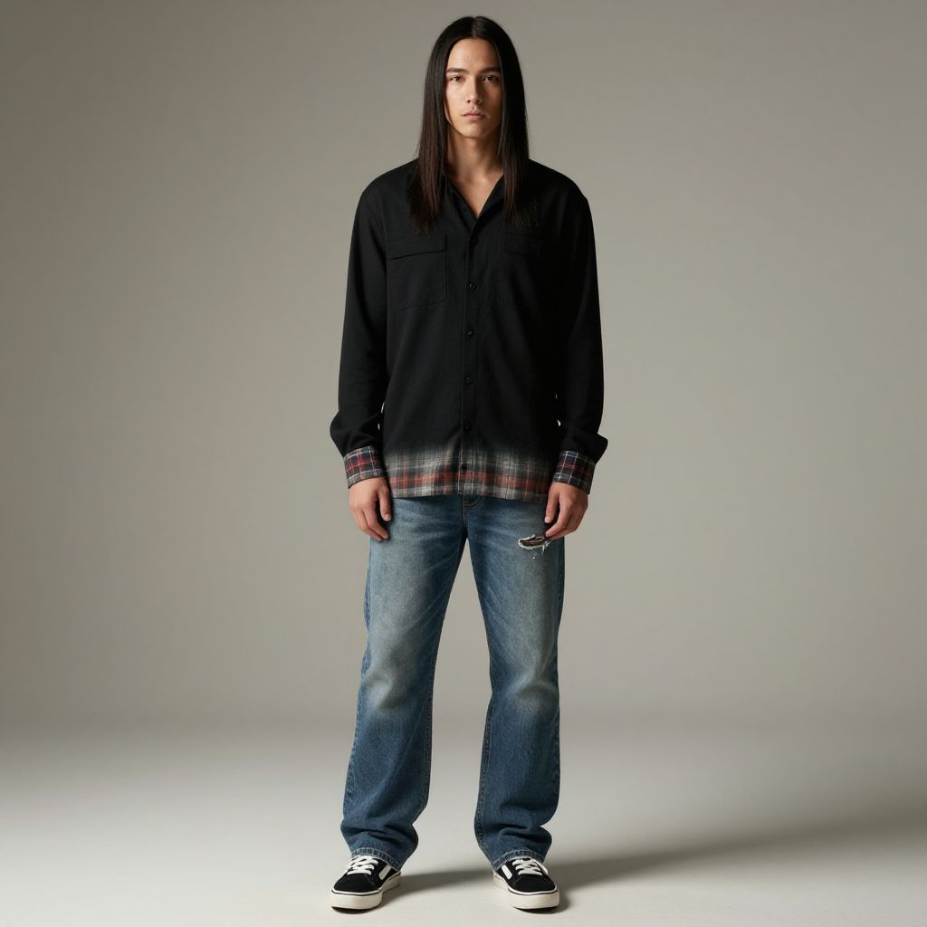 Photograph of a young man with long, straight black hair standing against a plain gray background. He wears a black, long-sleeve button-down shirt with a plaid pattern at the bottom and blue, slightly baggy jeans. His black sneakers have white laces and soles. He stands with his hands by his sides, looking directly at the camera with a neutral expression. The lighting is even, highlighting the textures of his clothing and the subtle shadow beneath him.