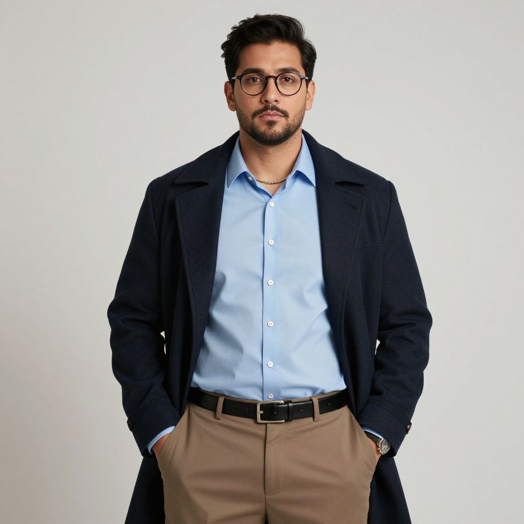 Photograph of a young South Asian man with a medium build and short, dark hair, standing against a plain gray background. He has a trimmed beard and a focused expression. He wears a dark navy, long-sleeved button-up shirt with the sleeves slightly rolled up and black pants. His hands are casually placed in his pockets. The lighting is even, highlighting his facial features and the texture of his shirt. The overall style is modern and minimalist.