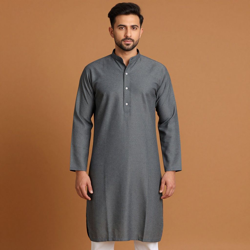 "indo western clothes man, 1boy, male focus, solo, facial hair, shirt, pants, black hair, grey background, beard, collared shirt, hands in pockets, simple background, mustache, cowboy shot, closed mouth, short hair Realistic photo of casual sexy person with pretty face"