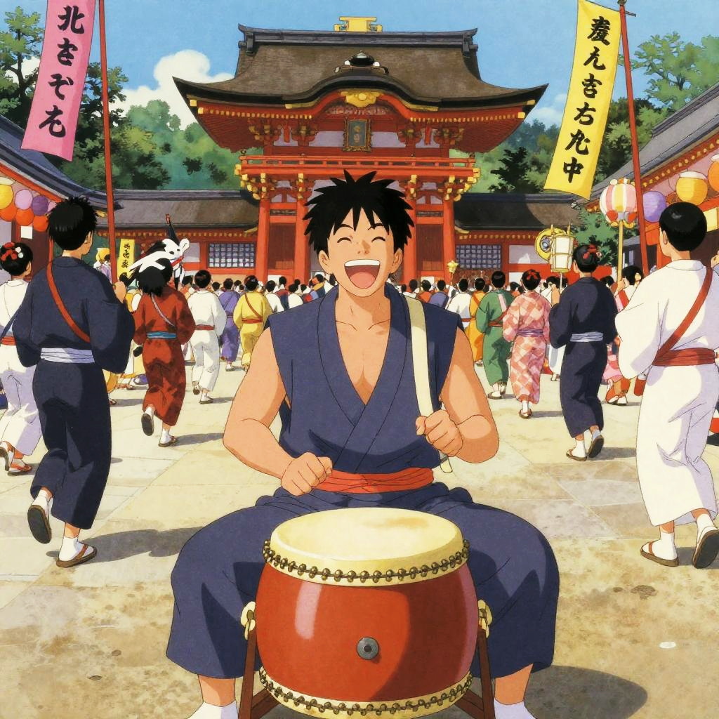 A jovial festival drummer, wearing a sleeveless happi coat, sitting in a vibrant shrine festival ground, surrounded by dancing crowds and colorful festival decorations, illustrated in the nostalgic and atmospheric manga style of Tadao Tsuge.