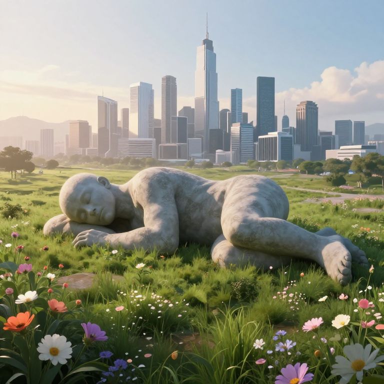 An expansive cityscape emerges from the prone figure of a colossal being resting in a verdant field, presented within a surreal landscape. From an elevated perspective, dawn illuminates both the futuristic metropolis and the impressionistic flowers that blanket the earth. The rigid structures and precise geometry of the city juxtapose against the soft, natural forms of the slumbering giant and the flora, creating an atmosphere that oscillates between serenity and awe, encouraging viewers to contemplate the intriguing nexus where reality converges with fantasy.