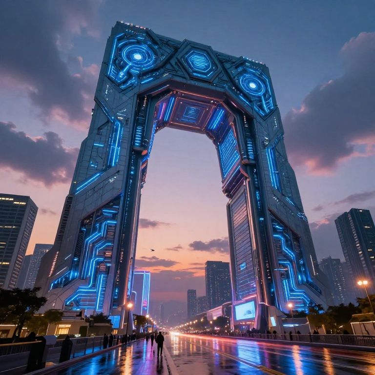 Photograph of a futuristic, illuminated archway at dusk, with blue neon lights outlining its geometric, robotic design. The archway stands tall in the center, with its intricate patterns glowing brightly against a pink and purple sky. Reflections of the lights shimmer on the wet pavement below. Surrounding the archway are modern skyscrapers, their windows faintly glowing. Silhouetted figures walk along the pathway leading through the arch, with streetlights casting a warm glow. The overall scene is vibrant and futuristic, blending urban elements with sci-fi aesthetics.