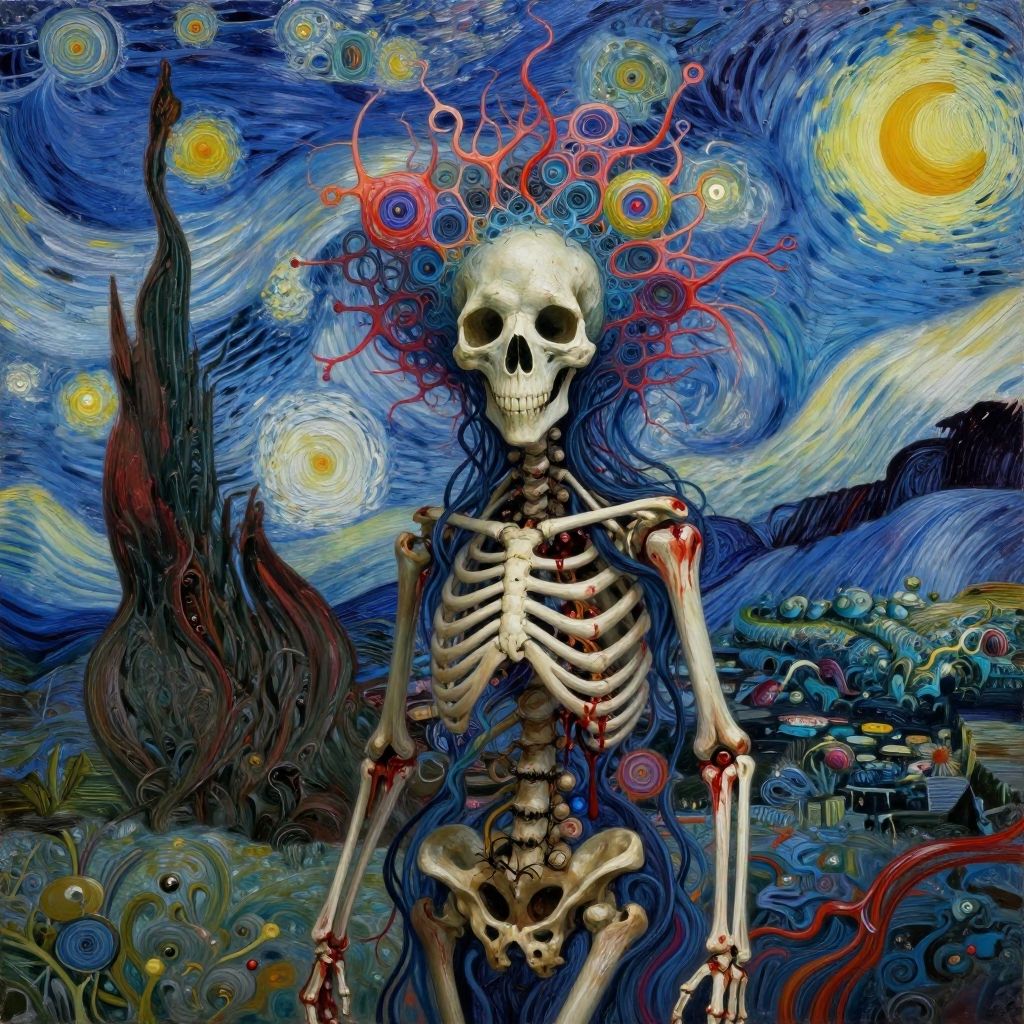 Digital artwork of a skeletal figure with red, swirling hair in a vibrant, Van Gogh-style night sky, featuring colorful stars and a village. Blood