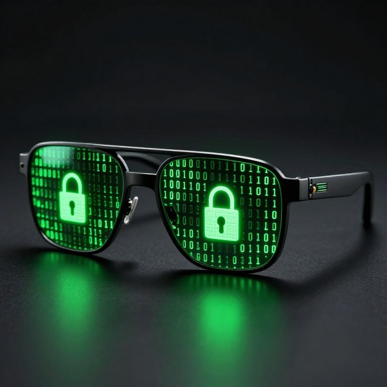 Photograph of futuristic black sunglasses with glowing green binary code and padlocks on lenses, set against a dark background.