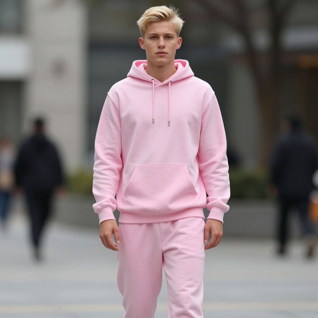 Photograph of a young, blonde Caucasian man with fair skin, wearing a light pink hoodie and matching pants, walking down a city street with blurred background