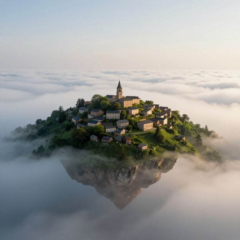 Photograph of a picturesque, cloud-covered island topped with a quaint village featuring a central church with a pointed steeple. The island is surrounded by a thick layer of mist, creating a dreamy, ethereal effect. Green trees and buildings with beige and brown rooftops cluster around the church. The island reflects in the mist below, adding symmetry to the image. The sky is a gradient from light blue to white, enhancing the serene atmosphere. The photo captures a magical, almost surreal scene, blending natural beauty with human architecture.