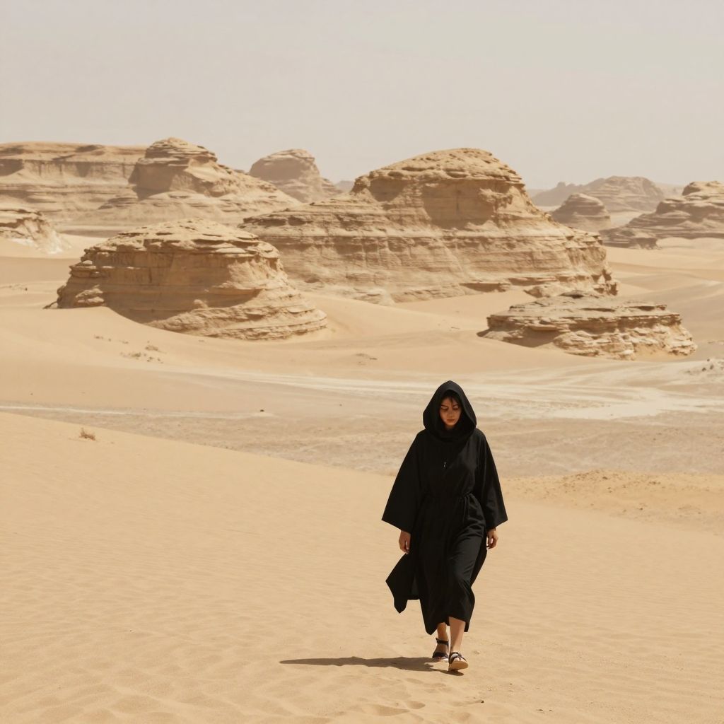 Masterpiece, best quality, desert, rock formations, plateau, sandstorm, solo, 1girl, tanned, walking, cloak, black hooded robe, sandals, wide shot