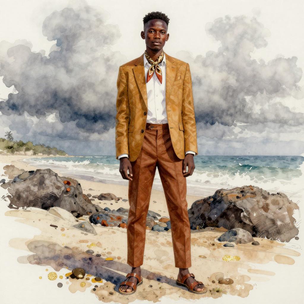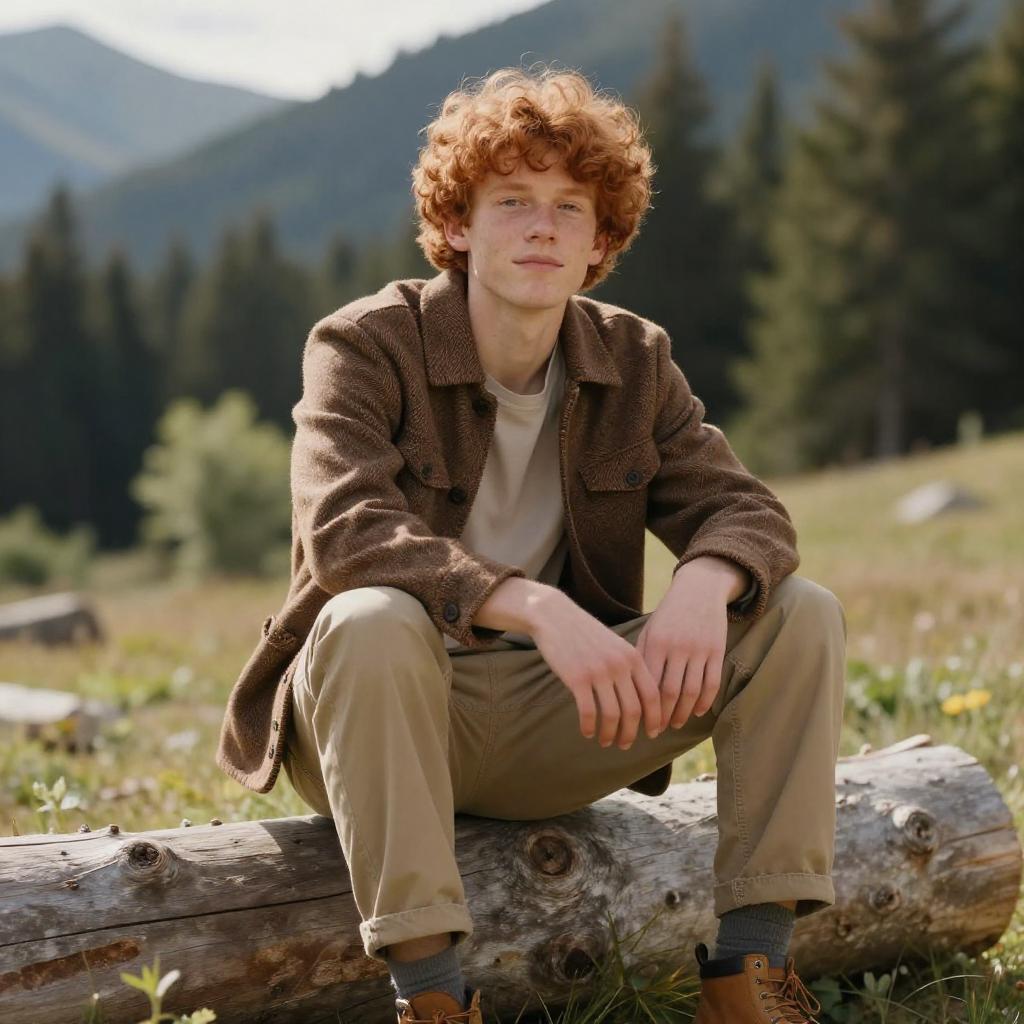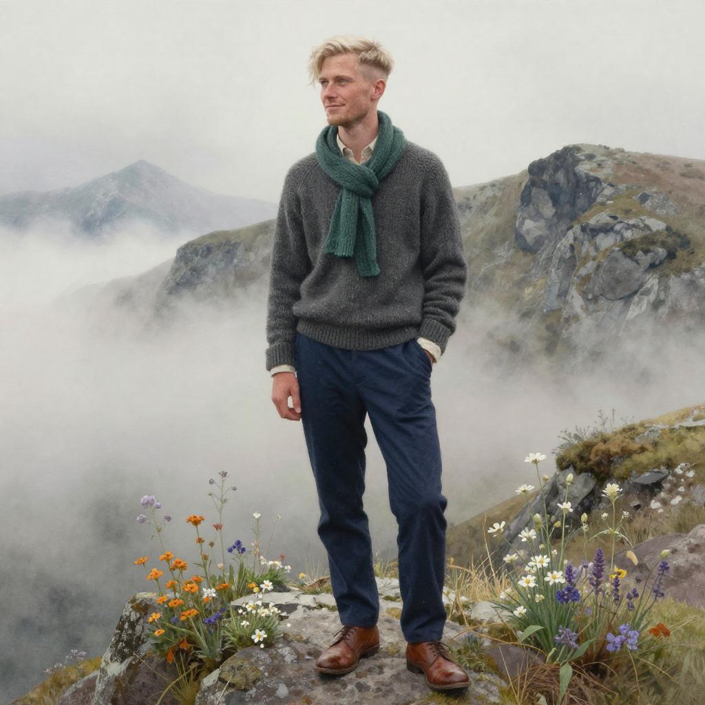 An artistic portrayal of a young Scandinavian man with a platinum-blond undercut, light stubble, pale freckled skin, and thoughtful blue-gray eyes, relaxed wistful smile dressed in a hand-knit charcoal fisherman’s sweater layered over a cream linen shirt, tailored navy wool trousers, worn brown leather brogues, and a sea-green knitted scarf draped loosely around his neck, standing on a misty mountain ridge surrounded by blooming wildflowers, rendered in an ethereal Nordic plein-air watercolor with subtle gouache highlights, cool desaturated palette, soft misty backlighting, delicate paper texture and gentle brushwork.