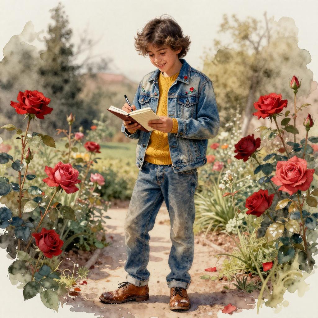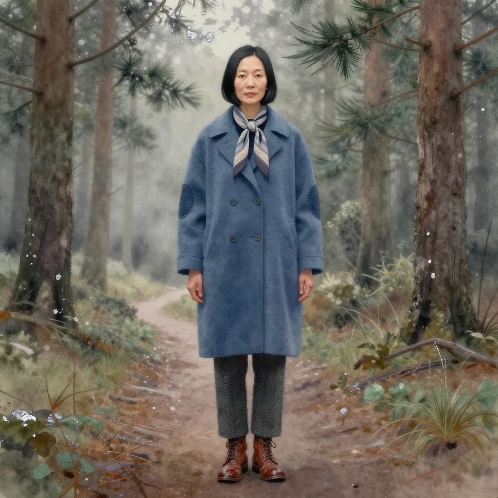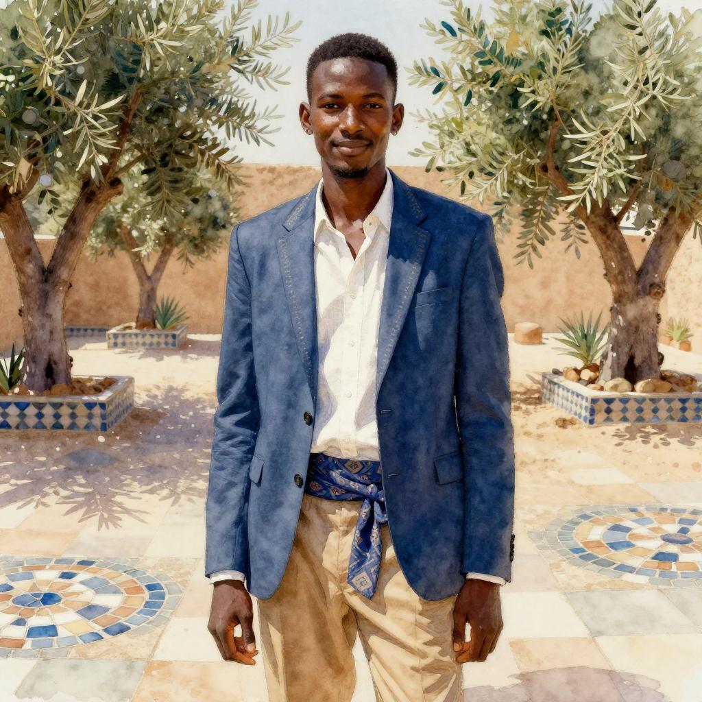 An artistic portrayal of a young Scandinavian man with a platinum-blond undercut, light stubble, pale freckled skin, and thoughtful blue-gray eyes, relaxed wistful smile dressed in a hand-knit charcoal fisherman’s sweater layered over a cream linen shirt, tailored navy wool trousers, worn brown leather brogues, and a sea-green knitted scarf draped loosely around his neck, standing on a misty mountain ridge surrounded by blooming wildflowers, rendered in an ethereal Nordic plein-air watercolor with subtle gouache highlights, cool desaturated palette, soft misty backlighting, delicate paper texture and gentle brushwork.