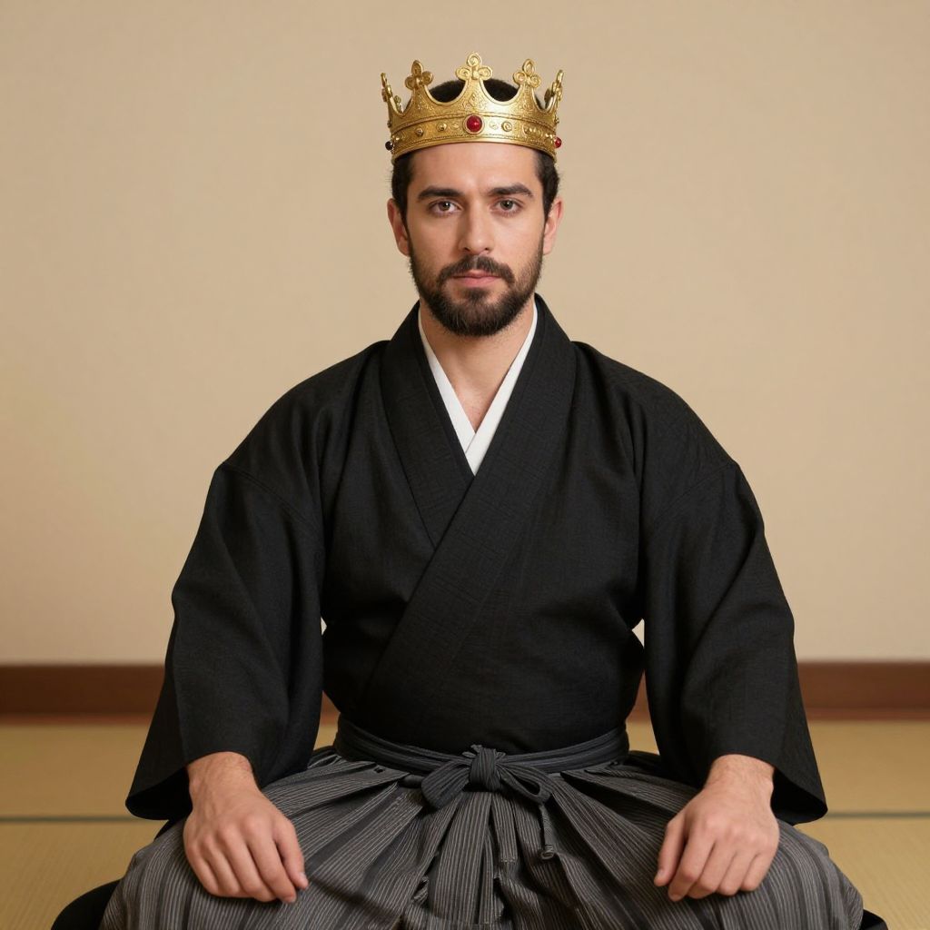 Man ryu costume, 1boy, solo, male focus, sitting, facial hair, realistic, long sleeves, crown, seiza, beard