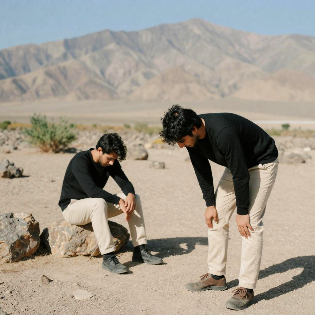 Man in blue suit, standing on sidewalk, looking down, holding a cigarette, next to broken wooden crate, street in background, car driving away, power poles, mountains in distance, clear blue sky.