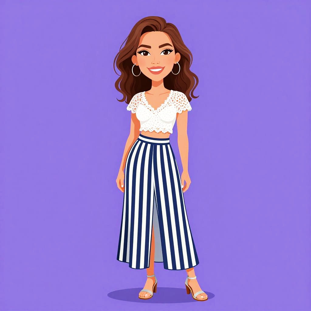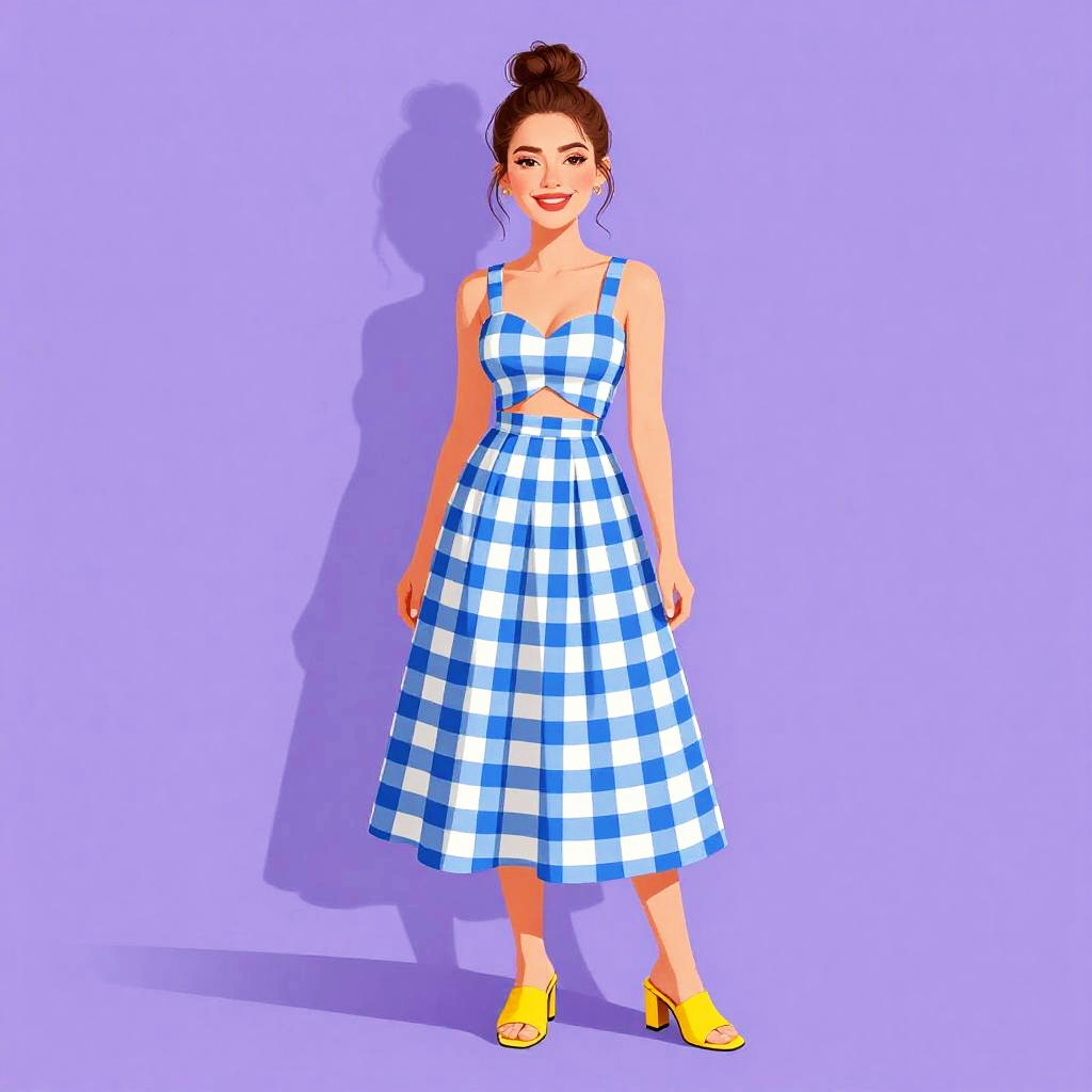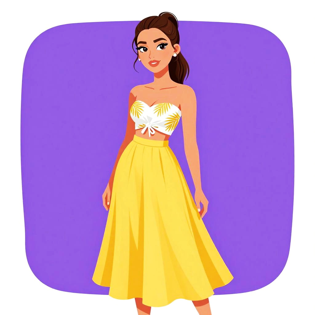 Woman with pretty face and pretty hair. Woman, tropical chic, bandeau-style tied crop top in white with golden palm leaf patterns, high-waisted flowing midi skirt in bright yellow, A-line cut, simple stud earrings, hair pulled back into a ponytail, white studio background. --sref 1467