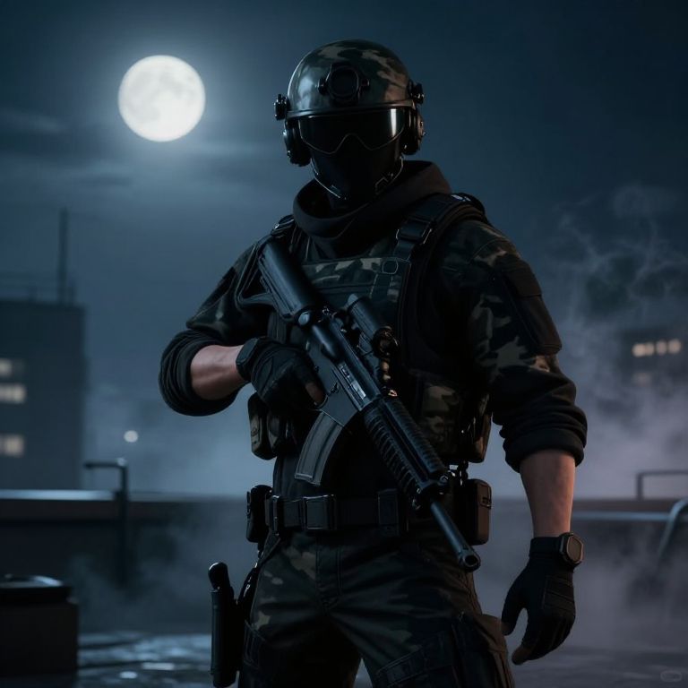 Spy Fortnite skin depicted as an elite covert operative blending into shadows, equipped with advanced spy technology and camouflage abilities, sleek helmet with visor, misty rooftop setting under moonlight, artistic smoke and light effects, immersive atmosphere