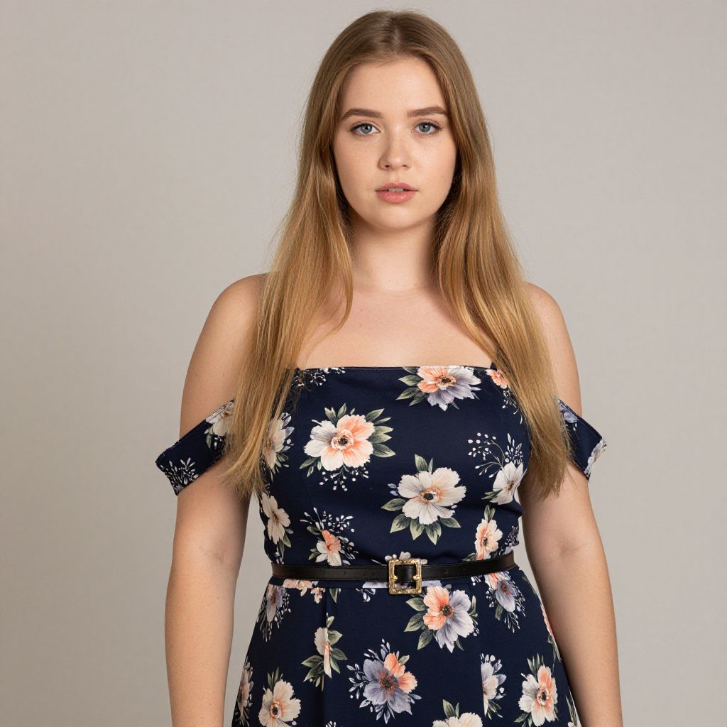 Photograph of a young Caucasian woman with long, straight, light brown hair and fair skin. She has blue eyes and a neutral expression. She wears an off-shoulder, navy blue floral dress with white, pink, and orange flowers. The dress has a black belt with a gold buckle at the waist. The background is a plain, light gray, placing full focus on her. The image is well-lit, highlighting the soft textures of her dress and the smoothness of her skin. The overall style is simple and elegant.