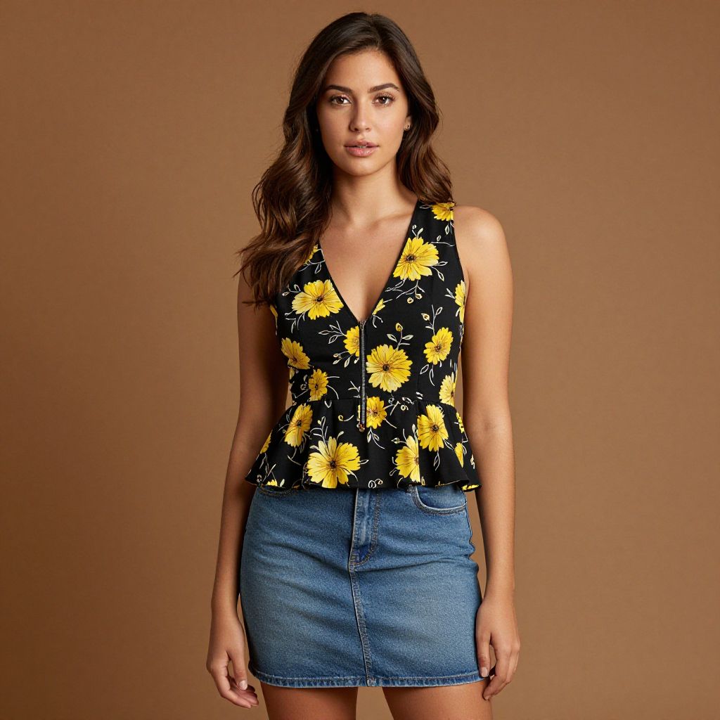 Photograph of a young woman with long, straight brown hair, wearing a navy off-shoulder floral dress, light skin, and a neutral expression