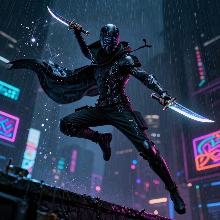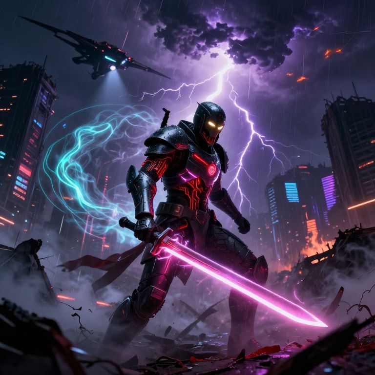A shattered dystopian metropolis sprawls beneath a storm-torn sky, where turbulent clouds churn with streaks of violet and fiery orange, illuminated by jagged lightning that cuts through the gloom, The air is alive with the chaos of a soulstorm—an ethereal tempest of swirling, spectral energy that spirals through the ruins, its glowing trails pulsing with hues of cyan, crimson, and ghostly silver, Sharp, directional lighting breaks through the chaos, casting dramatic shadows that ripple across the cracked surfaces of the decayed cityscape, In the foreground, a close-up reveals a lone figure standing amidst the storm, His armor, a blend of matte black plating and glowing red circuitry, glistens with droplets of rain and spectral light as arcs of energy reflect off its surface, The figure grips a humming plasma blade, its shifting magenta glow illuminating their tense posture and the twisted tendrils of fog that coil around his feet, His visor flashes with a faint amber glow, concealing their expression as the storm’s howling winds whip past them, Behind, colossal drones hover silently, their searchlights cutting through the haze, while towering ruins flicker with remnants of holographic propaganda, The soulstorm intensifies, lightning illuminating the ghostly forms of spectral beings caught within its grasp, their haunting wails echoing across the desolate landscape, The figure’s silhouette stands defiant, a stark contrast against the chaos and destruction swirling around them