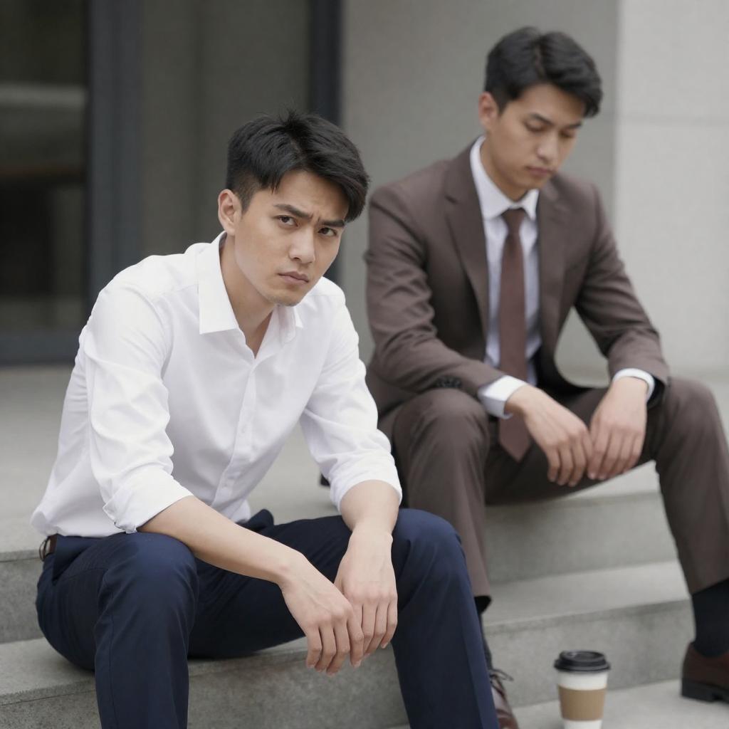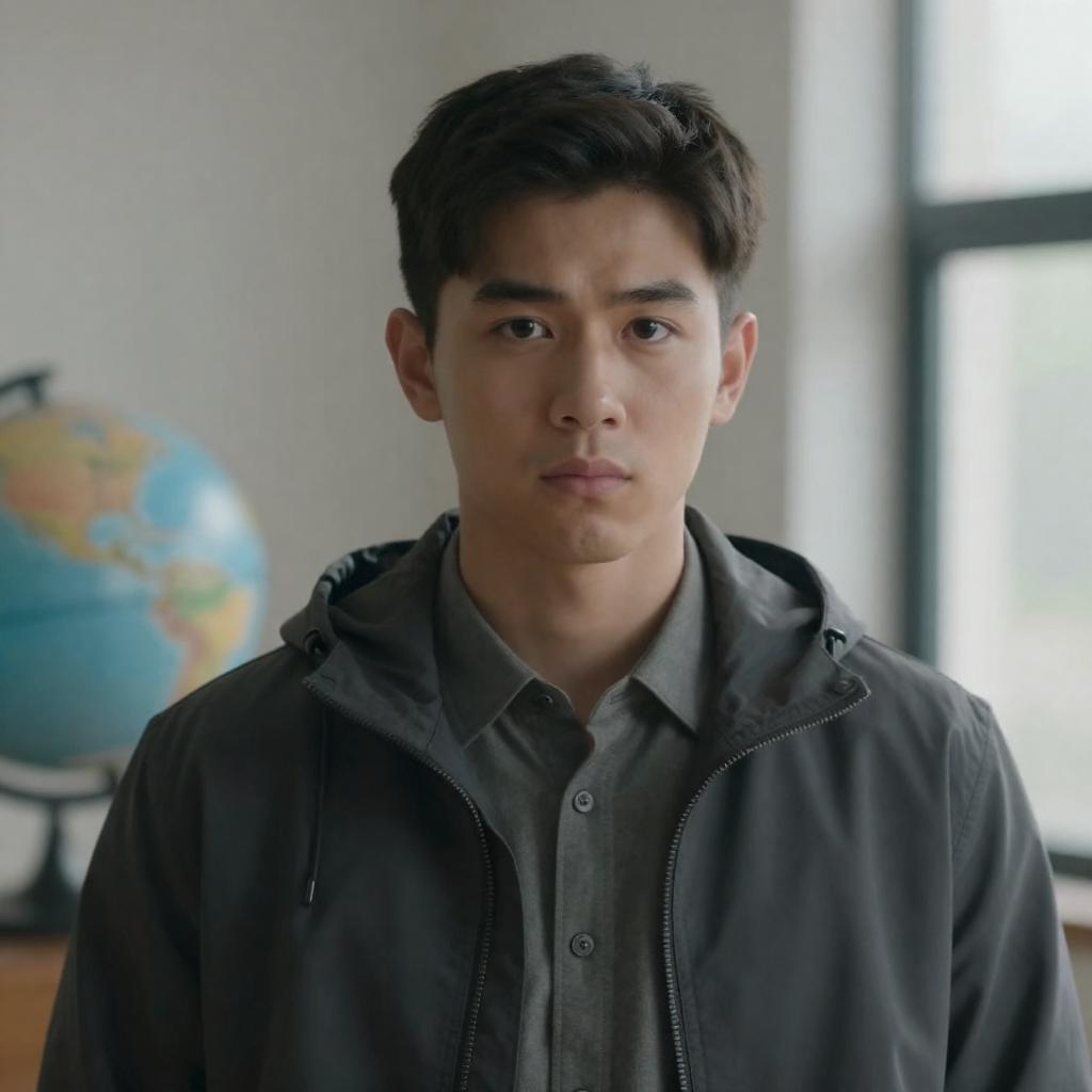 Young man with short, dark brown hair, wearing a white shirt, looking to the side with a slightly worried expression. Background has blurred green foliage. Upper body in focus, background out of focus.