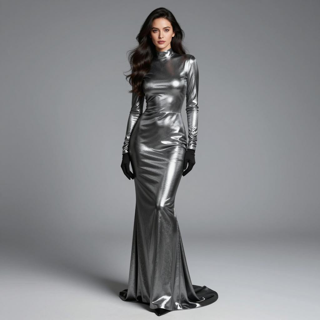 Full-length portrait of a woman wearing a sleek, shiny metallic silver gown with long sleeves and a high collar. The dress features a form-fitting silhouette with a dramatic train and matching black gloves. She has long dark hair styled in loose waves and a confident expression, set against a neutral gradient backdrop.
