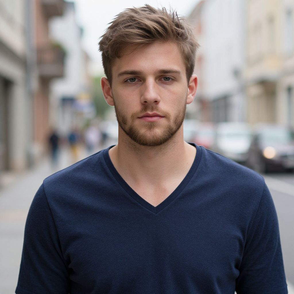 Photograph of a handsome, young Caucasian man with a light beard and short, slightly messy brown hair. He's wearing a dark blue, V-neck, long-sleeve shirt. His expression is neutral, looking directly at the camera. The background is a blurred urban street with buildings and a few cars. The lighting is natural, giving the image a soft, slightly overcast feel.