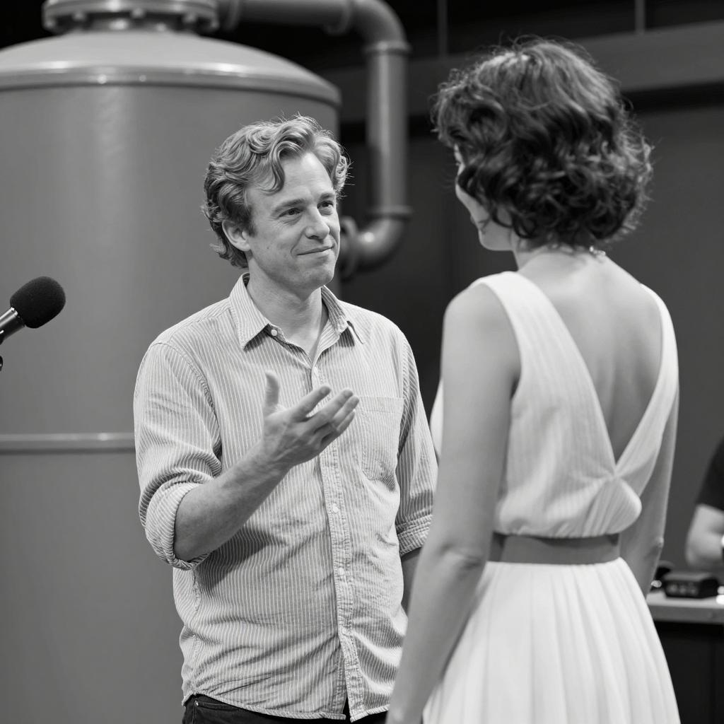 Two men on stage, illuminated by stage lights. The older man with white hair and glasses wears a white shirt, holding a model of a mechanical device. The younger man with short brown hair wears a red vest over a gray shirt. Both have focused expressions. Dark background with a visible light source behind them.