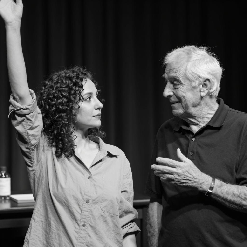 An elderly man with white hair and glasses, dressed in a white shirt, holds a model of a mechanical device while a younger man with short brown hair wearing a red vest over a gray shirt observes attentively. Both men are on stage under bright stage lighting with a dark background.