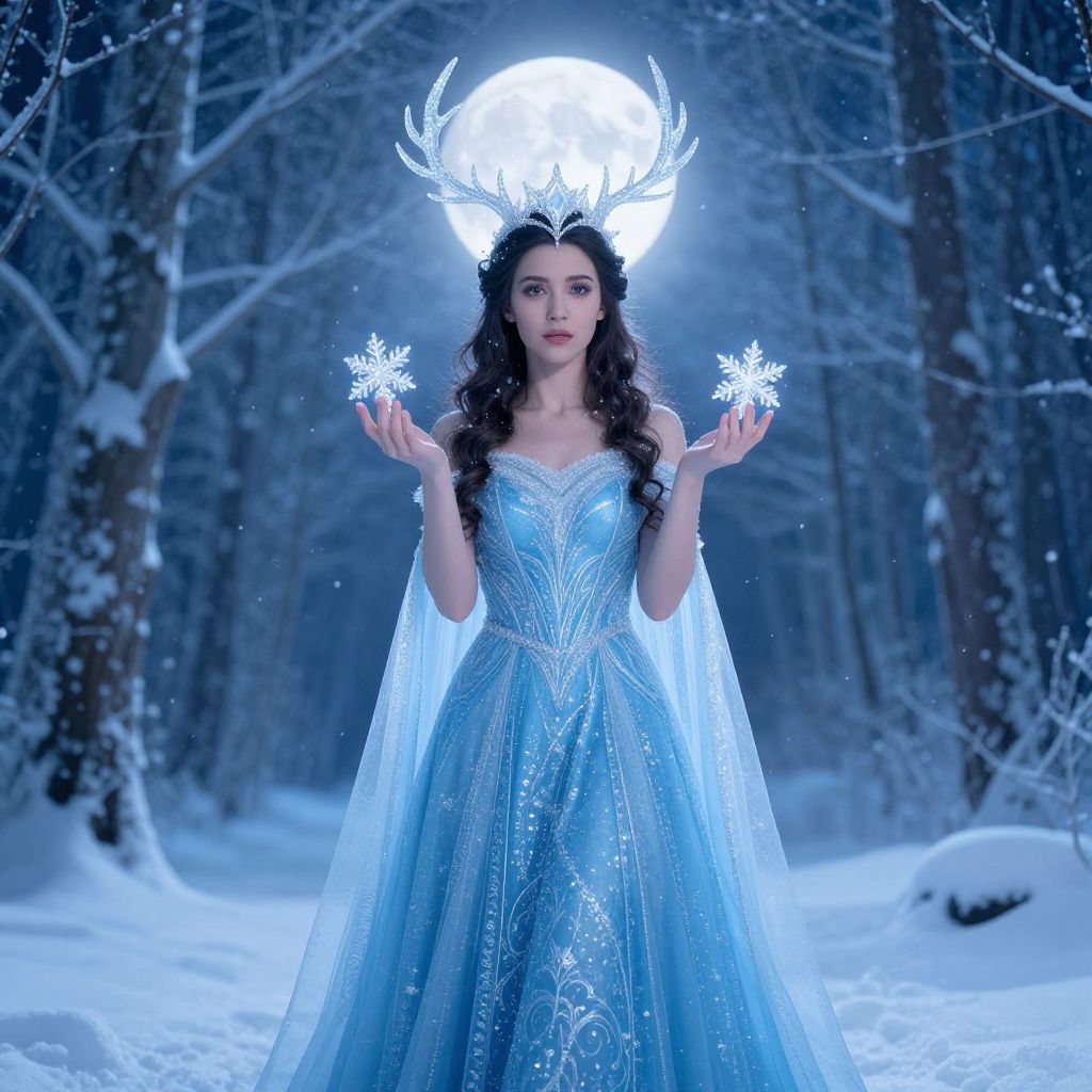 A majestic woman stands in a snowy, frozen forest, dressed in an elegant blue gown adorned with intricate patterns. She wears a crown with crystal-like antlers and holds delicate snowflakes in her hands, illuminated by the glowing full moon behind her in this fantasy digital artwork.
