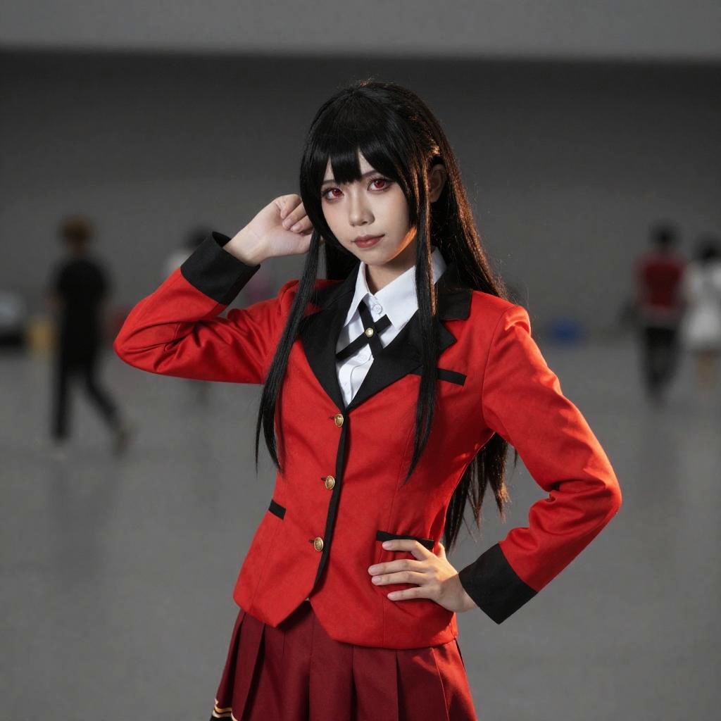 Young woman wearing a red hooded cape with matching red suspender skirt and white ruffled blouse. The outfit includes a brown belt with a buckle and lace-up front details, styled for roleplay or cosplay. The woman has short black hair and a neutral expression, posed outdoors with a blurred natural background.