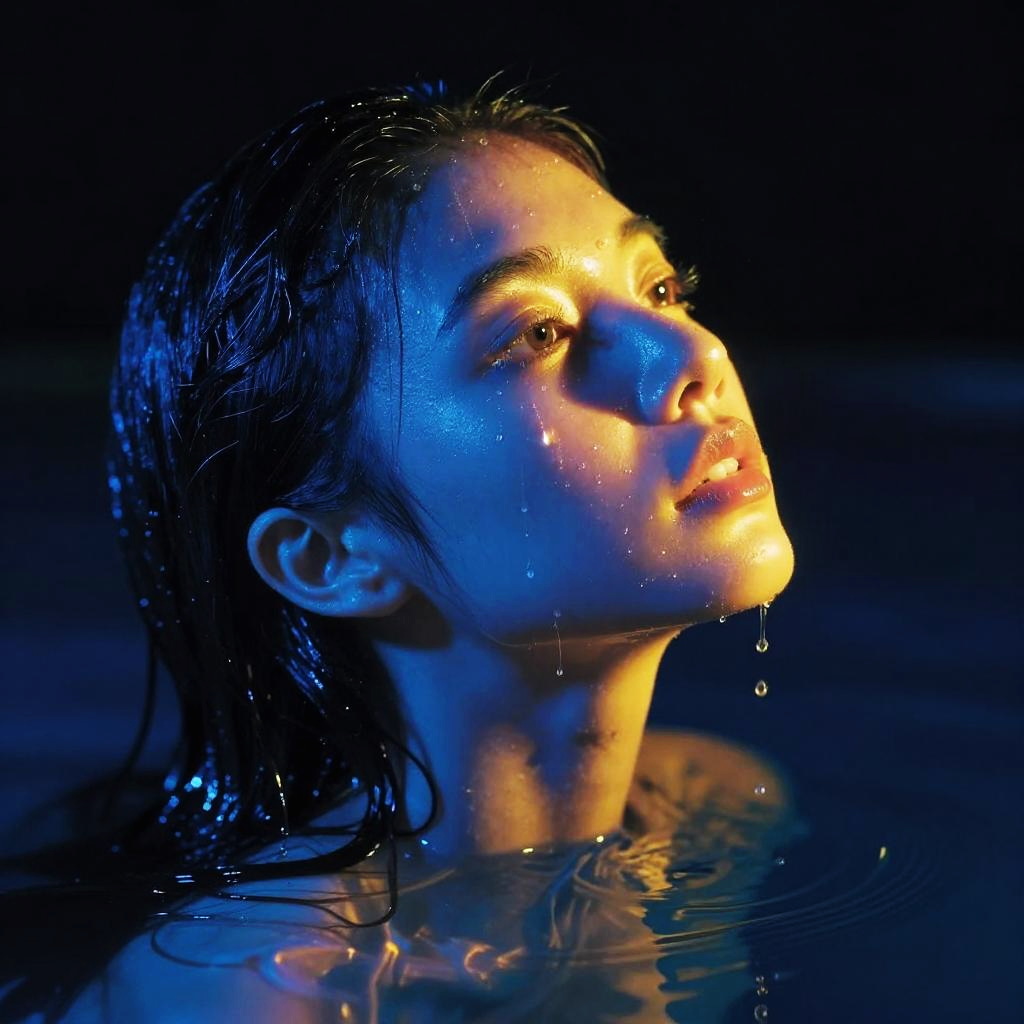 A photograph of a person's face illuminated by vivid, neon-like blue and orange lights, submerged in water. The dark background contrasts with the glowing lights on their face and wet hair. Water droplets and light reflections create a mesmerizing, almost otherworldly effect. The person's expression is calm, with a slight upward tilt of the chin.