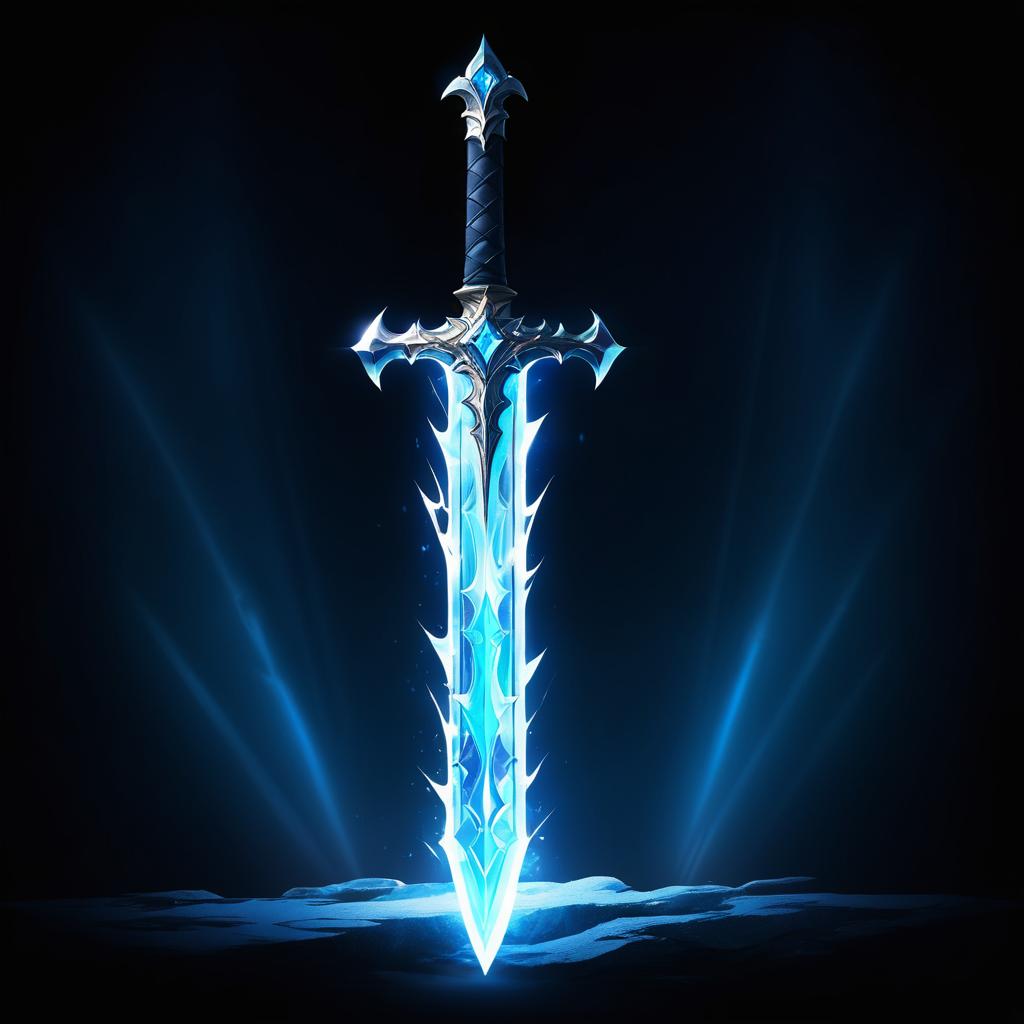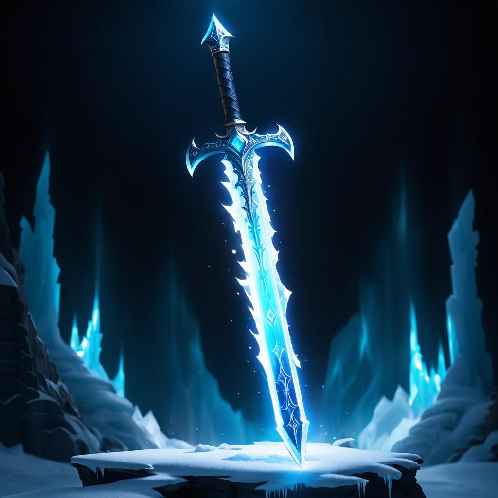 A digitally rendered legendary ice sword with intense glowing blue effects. The sword features ornate designs and a dark, wrapped handle, standing upright on a snow-covered rock surface in an icy cave environment with sharp ice formations illuminated by a mystical blue light.