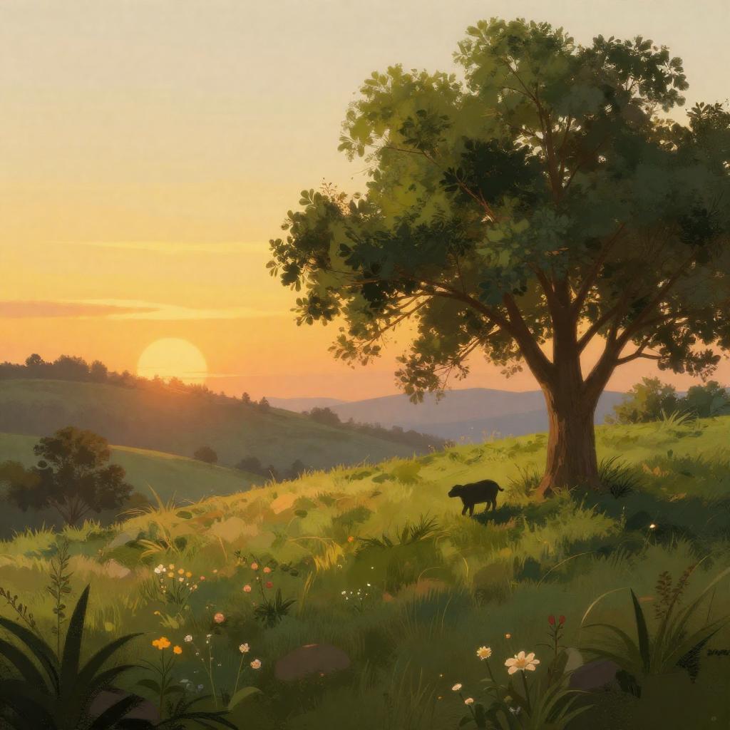 Digital painting of a serene forest scene. Two tall, brown trees with sparse leaves stand in the foreground, casting shadows on a reflective, shallow stream. In the background, a small blue tent and two small figures are visible on a grassy clearing. Soft sunlight filters through the trees, creating a warm, inviting atmosphere.