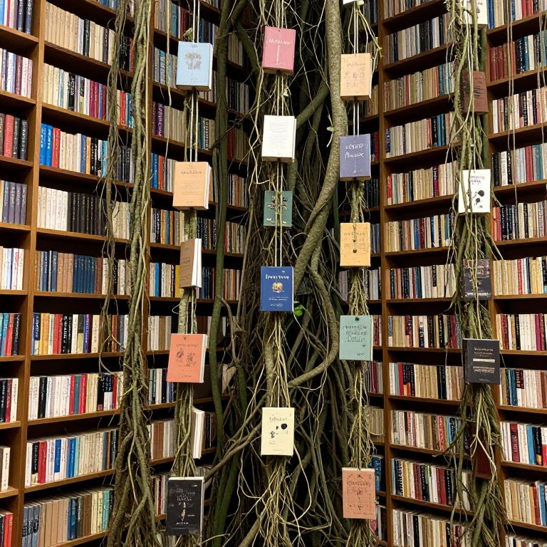 A library grows like a vine forest, each book suspended from trailing roots that change their content based on the emotions of the reader as they climb.