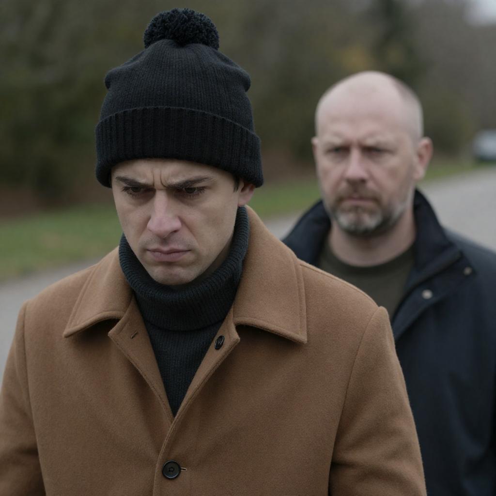Portrait of two men seated in a devastated urban environment with rubble and broken brick walls. The man in front is white with dark hair, wearing a beige coat over a brown turtleneck, displaying a serious expression. The man behind him is black with a beard, wearing a grey knit hat, a dark jacket over a blue hoodie, with an intense gaze towards the camera. The background shows scattered debris and damaged structures.