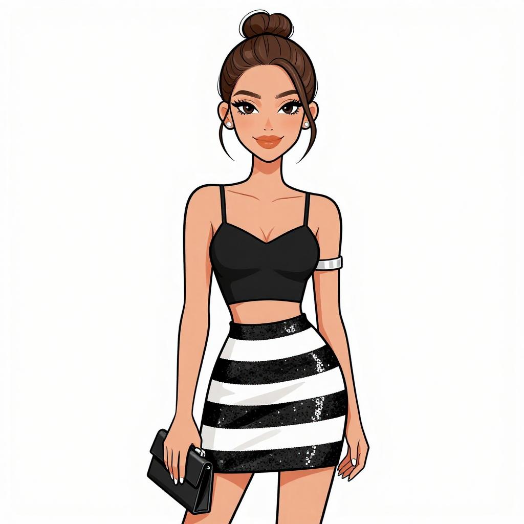 Woman with pretty face and pretty hair. smiling Woman, modern chic, black crop top with spaghetti straps and cut-out detail at the waist, high-waisted mini skirt with horizontal black and white sequined stripes, minimalist silver arm cuff, small black clutch with a silver clasp, casual high ponytail, plain white studio background. --sref 1467