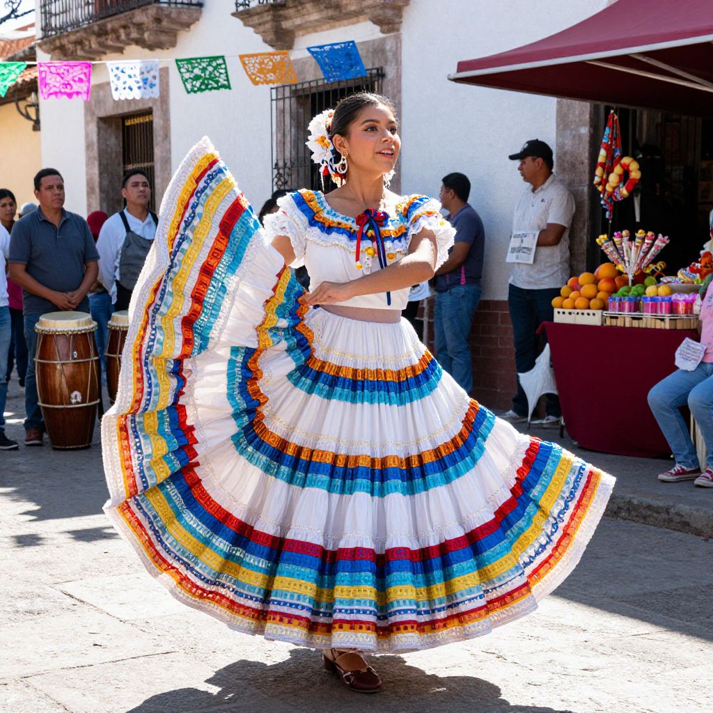 Photograph of a Mexican woman in a colorful traditional dress, performing a dance on a sunlit street, with onlookers and market stalls in the
