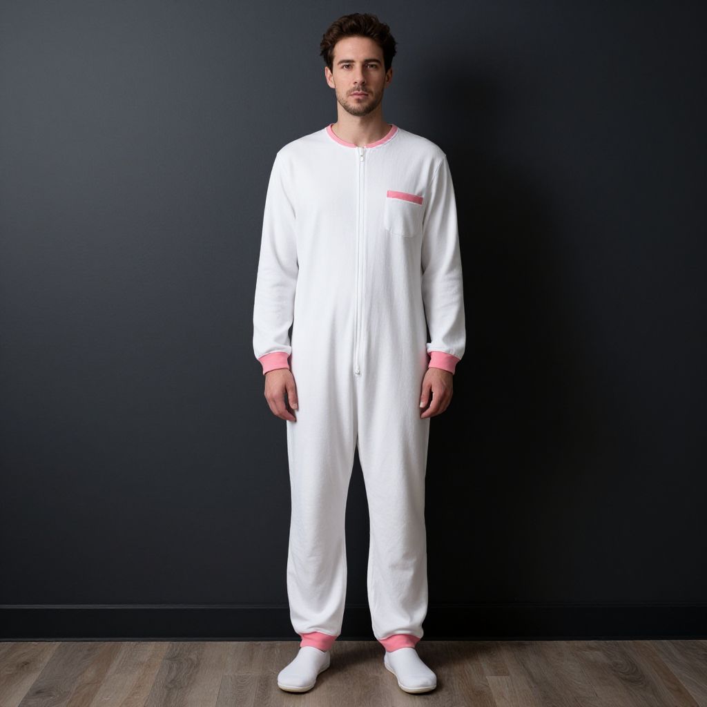 "Sleepsuits Years, man in pajamas standing in front of a wall with a dark background"