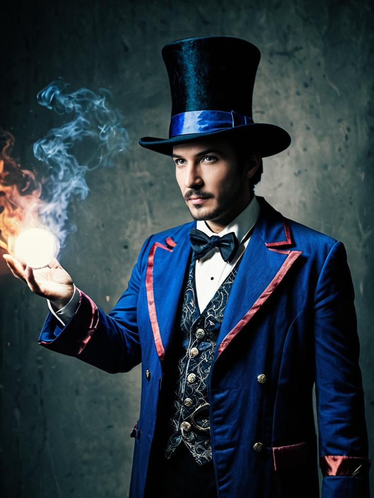 Portrait of a man dressed in an elaborate magician costume featuring a blue and red coat, patterned vest, white shirt, black bow tie, and tall black top hat with blue ribbon, holding a glowing orb emitting smoke against a dark textured background.