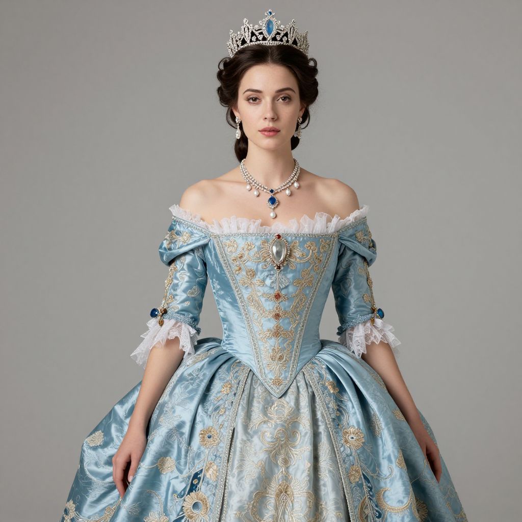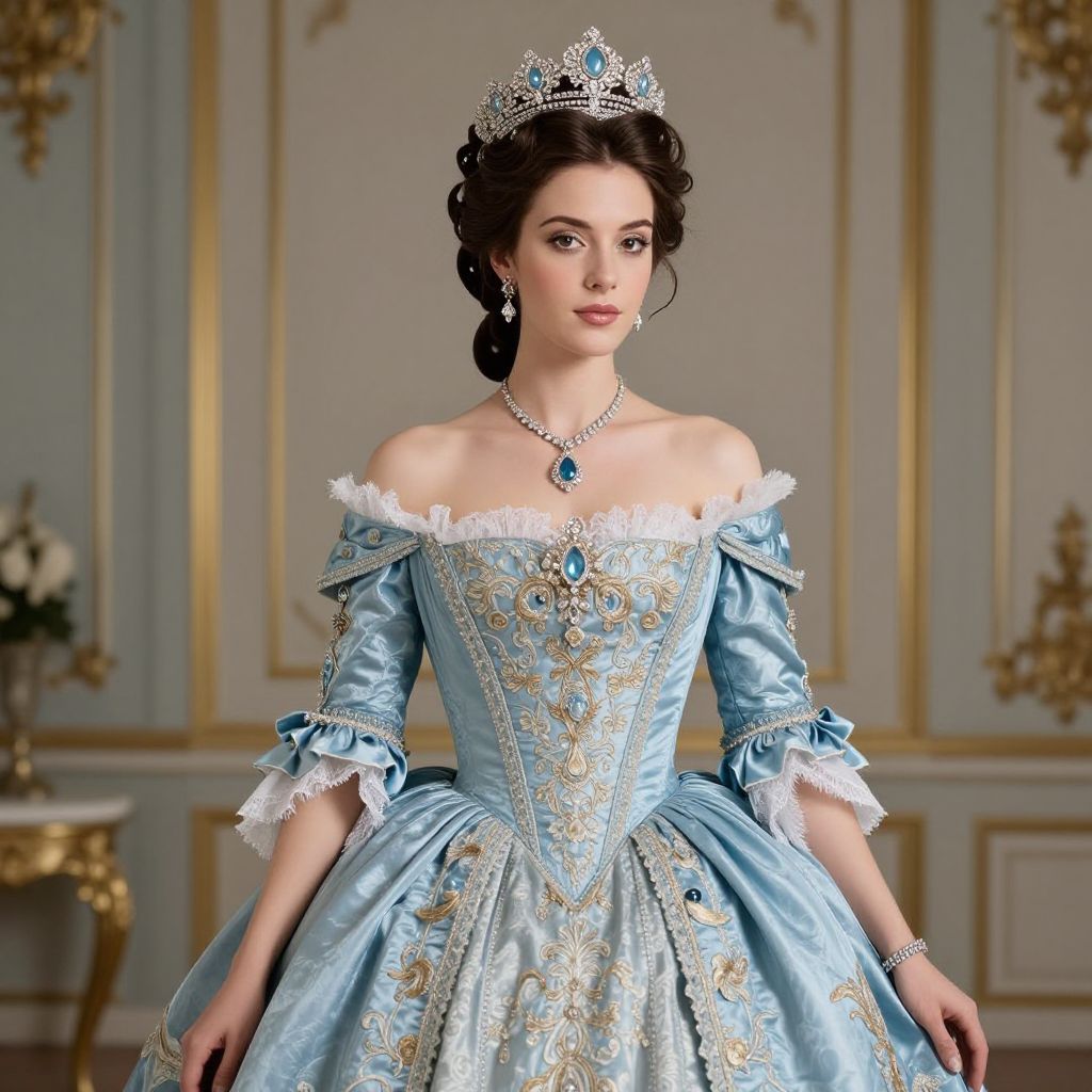 A woman exudes elegance in a stunning blue Rococo-inspired gown featuring intricate embroidery and off-the-shoulder detailing, complemented by a delicate crown and jewelry, captured in a high-definition digital rendering that evokes the opulence of Marie Antoinette's era.