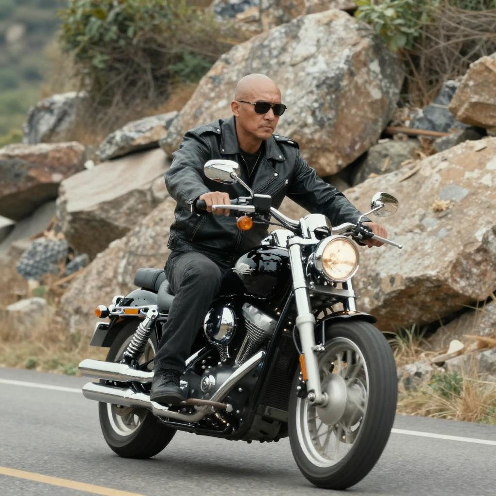A bald, serious-looking man with sunglasses rides a shiny black motorcycle through a rocky, outdoor landscape. He's wearing a black leather jacket and pants, and the motorcycle has chrome details and a round headlight. The background features large rocks and some greenery, with a blurred road in the foreground. The image has a slightly grainy texture, giving it a rugged, action-packed vibe.