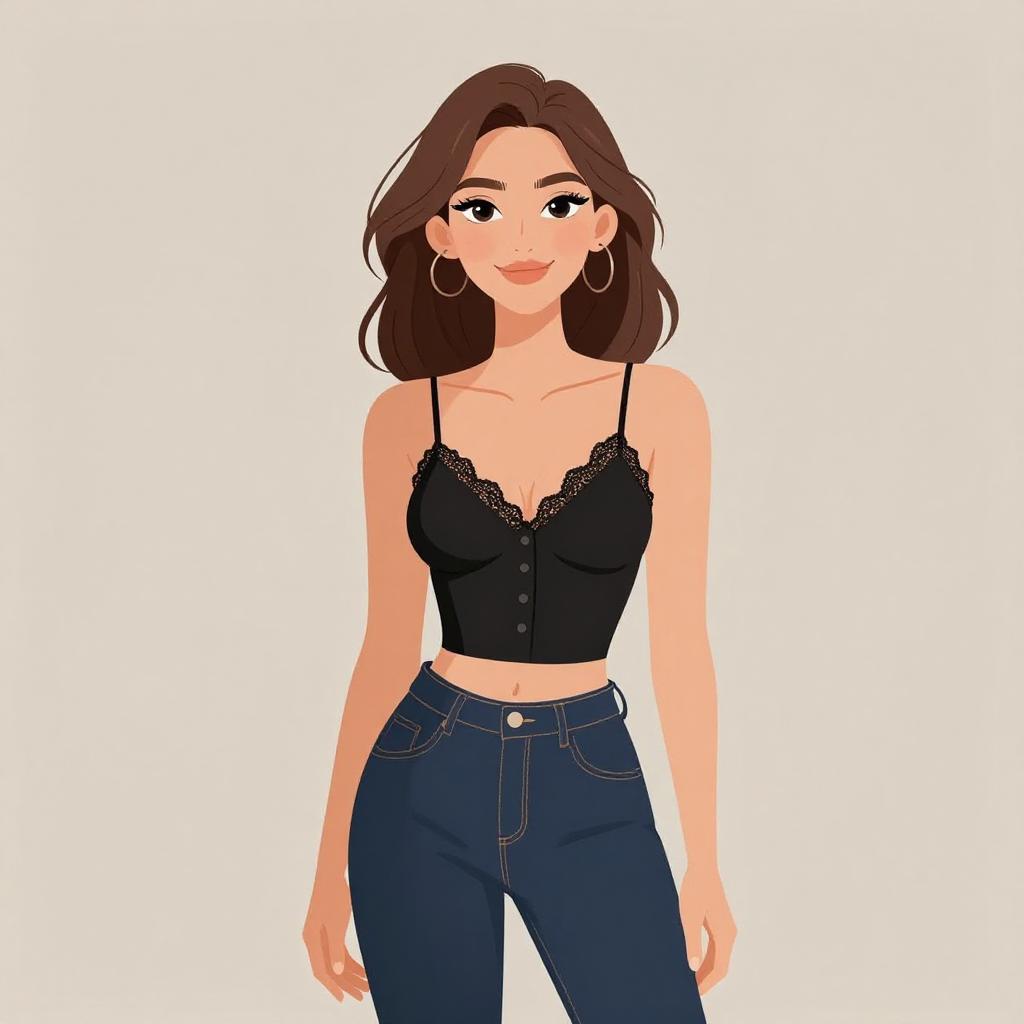 Woman with pretty face and pretty hair. smiling Woman, contemporary casual, off-the-shoulder top with polka dot print, three-quarter sleeves, white denim jeans, frayed hems, mid-rise fit, slender black belt with gold buckle, simple black choker necklace, neutral studio background. --sref 1467