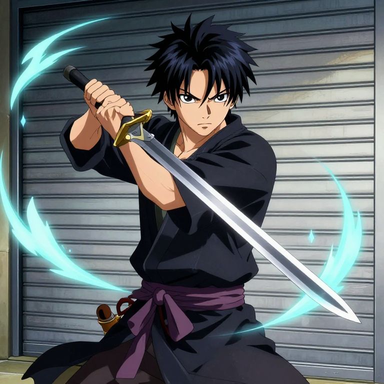 Anime-style drawing of a black-haired, blue-eyed young man wielding a glowing blue-energy sword, wearing a black shirt and purple sash, against a