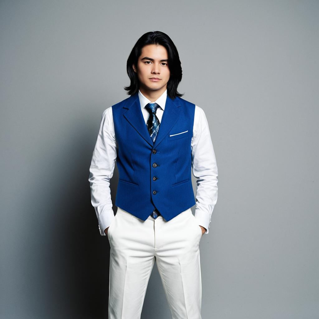 Portrait of a young man standing against a dark background, wearing a brown jacket over a bright blue collared shirt, paired with brown pants and a decorative black belt. The subject has black hair, a neutral expression, and is posing with arms relaxed at his sides.